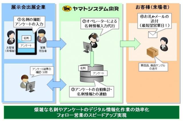| ヤマトホールディングス傘下のヤマトシステム開発株式会社(本社:東京都江東区、代表取締役社長:星野 芳彦、以下YSD)は、展示会に出展する企業向けに、展示会で取得した名刺のデジタル情報化と、アンケート結果の集計を最短翌営業日に行い、来場者へのフォロー営業を開始するまでの期間を短縮させる「展示会出展企業運営支援サービス」の提供を7月より開始いたします。 このサービスを導入することにより、これまで来場日から3~10日程度かかっていた、展示会来場者へのフォロー営業が最短翌営業日から可能になります。また、アンケートについても、専用アプリをインストールしたiPadを使用することで、結果の自動集計や、回答内容と来場者の名刺情報を紐付けた顧客管理をデジタル情報で行うことが可能になります。 |