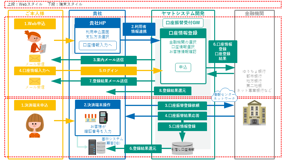 貴社HP経由で当社の受付サイトにアクセスいただく、または店舗に設置した専用の決済端末を使って、口座振替登録手続きが手軽に行えます。